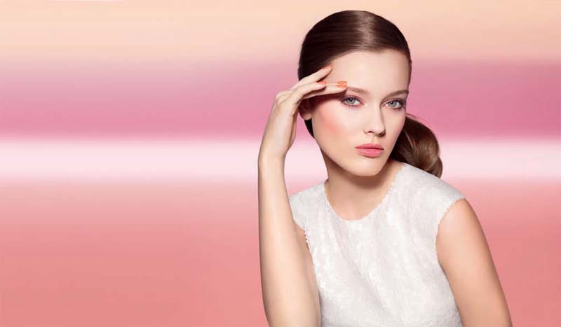 In frischen oder sonnigen Tönen betonte Wangen bringen eine heitere Note auf den reinen Teint. Der Blick wird mit Nude-Nuancen und leuchtenden Tönen aufgehellt, oder gibt sich der Verführung eines Lidschattens in Ambré mit Goldglimmer hin.